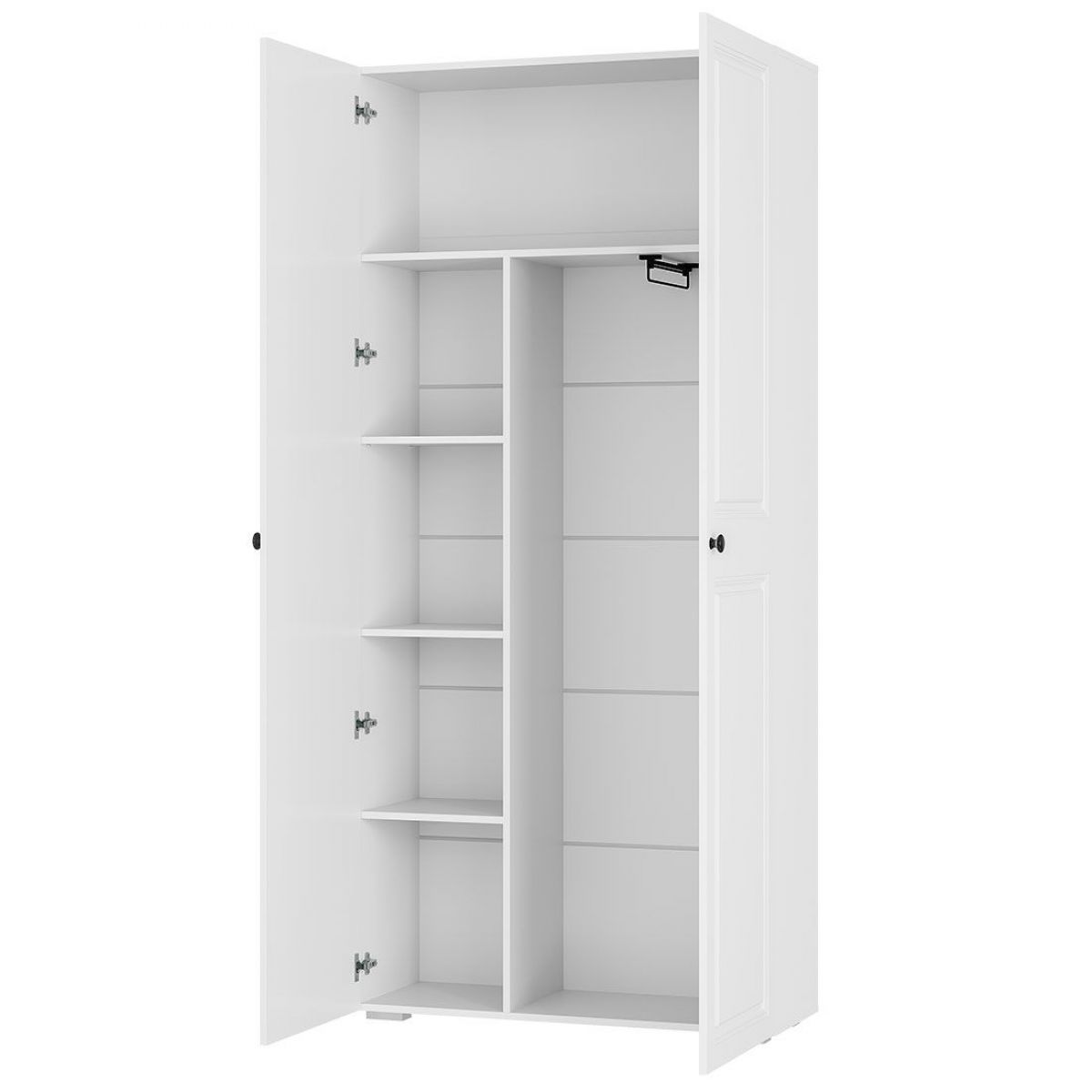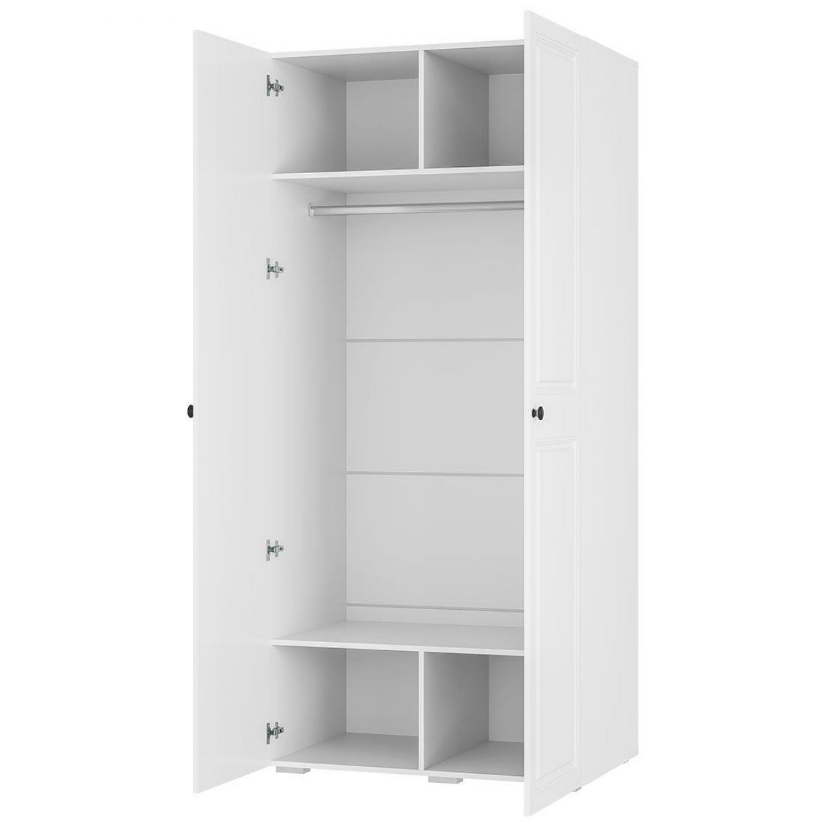 • Двухстворчатый шкаф «Софт» ШК-02 – вместительная модель, которая оснащена необходимыми зонами для хранения - просторным отделением с продольной хромированной штангой под вешалки для одежды и четырьмя полками для хранения различных вещей.